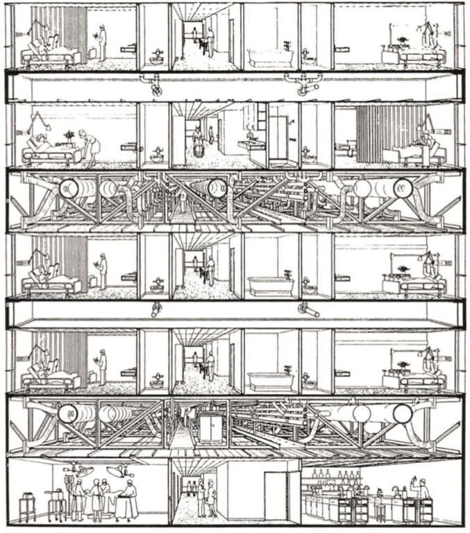Een ziekenhuis hoeft niet altijd alleen een ziekenhuis te blijven. Daar kun je op ontwerpen. Asselbergs: “Een ziekenhuis kent wel veel extra installatietechnische elementen die wanneer je het slim ontwerpt aparte stroken en zones voor schachten vergen. Daardoor is meer overmaat in het ontwerp van een ziekenhuis nodig. En die moet mee-ontworpen en meegefinancierd worden. Wanneer je dat niet doet heeft dat tot gevolg dat ziekenhuizen monofunctionele ‘fabrieken’ worden. Als je naar een kleinere, meer menselijke maat en schaal wilt – of moet, het zijn immers gebouwen voor mensen en geen machines – dan kun je de functie ‘ziekenhuis’ prima mixen met woon-, werk- en atelierruimtes en ontstaat een multifunctionele stad.”